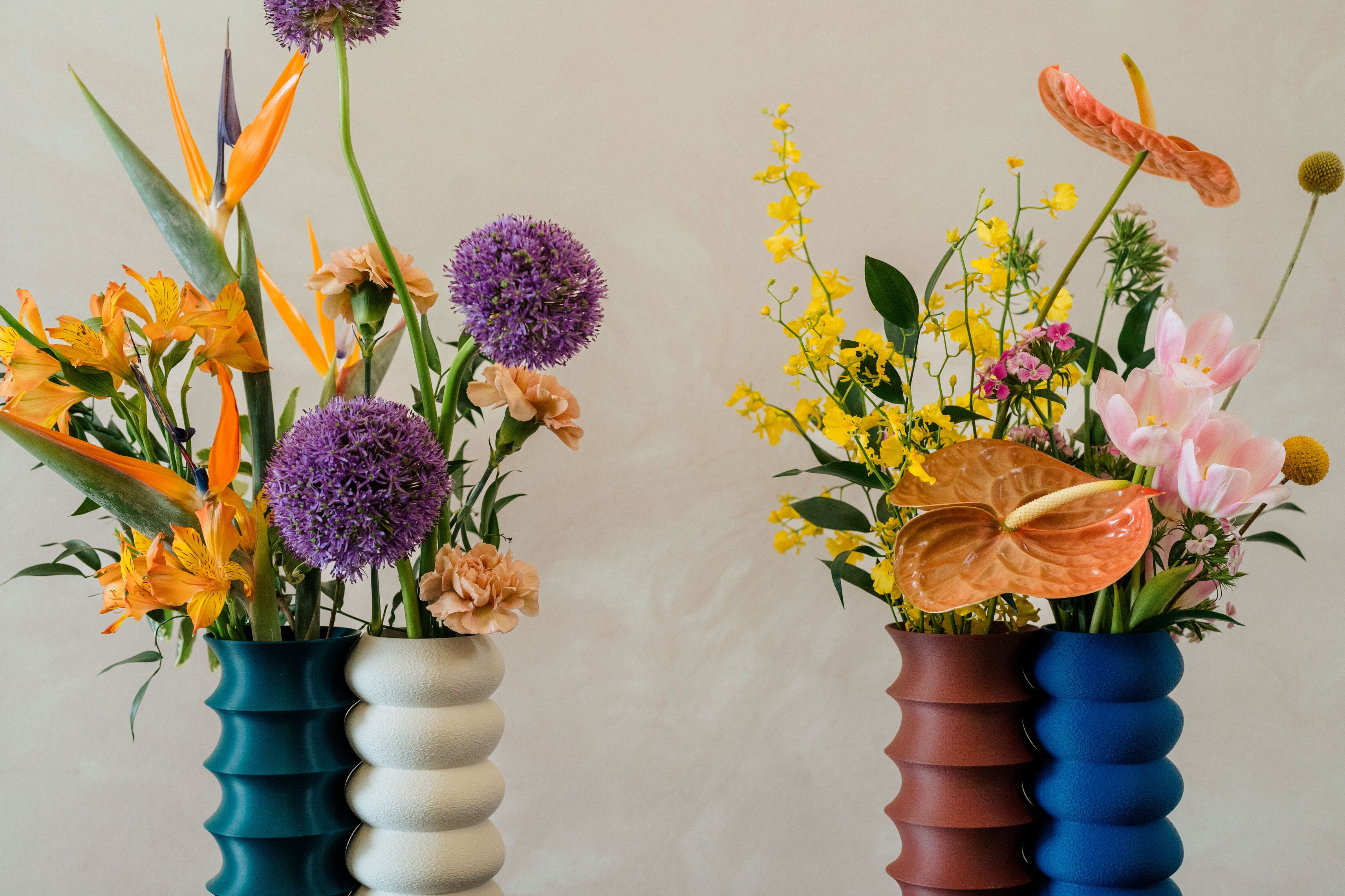 Introducing the Nestled Vases Collection — 3D-printed by Plook Plook. A series of sculptural vases designed to hold more than just flowers, each piece is thoughtfully paired with fresh, vibrant blooms and styled to bring joy, personality, and a little design magic into your space.